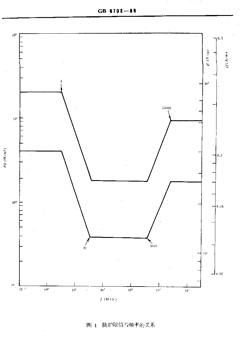 本規定中防護限值的適用頻率范圍為 100 k Hz 300 GHz。防護限值與頻率的關系見下圖。